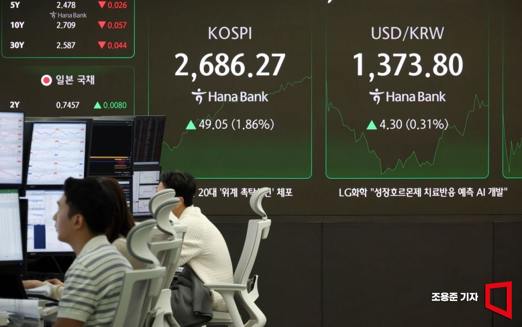 EU관세 유예 발표에 미 증시가 상승 마감한 가운데 국내 코스피도 상승 출발한 28일 서울 중구 하나은행 본점 딜링룸 현황판에 코스피와 원/달러 환율 등이 표시돼 있다. 이날 코스피는 10시20분 현재 1.81% 상승한 2.685.33를 원/달러 환율은 3.10원 오른 1372.70원을 기록하고 있다.