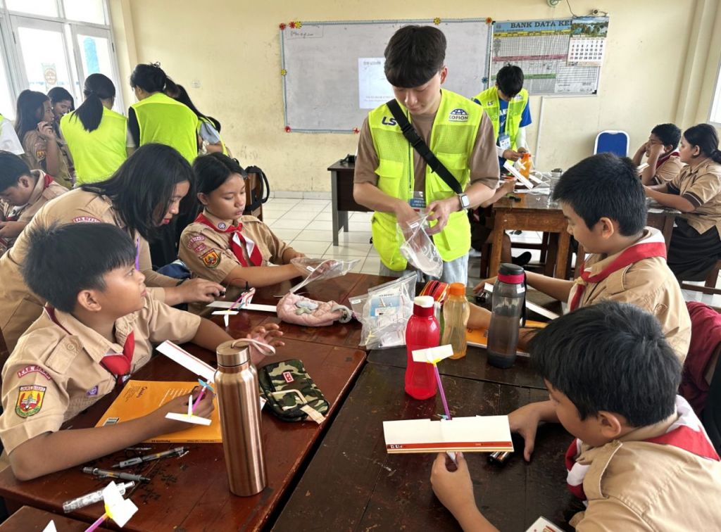 지난해 8월, LS 대학생 해외봉사단 27기 단원들이 인도네시아 단비 초등학교에서 학생들을 대상으로 과학키트 만들기 체험학습을 진행하고 있다. 사진=LS그룹