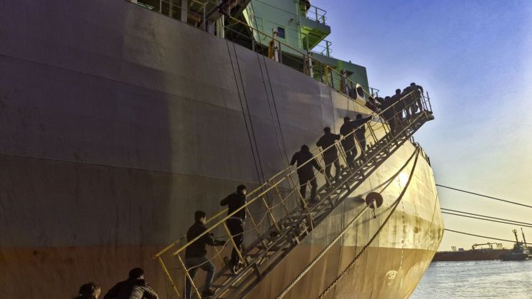 지난달 2일 관세청과 해양경찰청 합동 검색팀이 마약밀수 단속을 위해 강릉 옥계항에 입항한 선박에 오르고 있다. 선박 내 밀실에서는 코카인으로 의심되는 마약류 2t 상당이 발견됐다. 관세청 제공