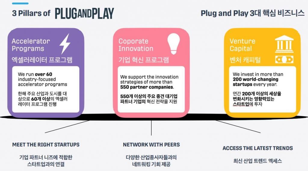 플러그앤플레이는 전 세계 유망 스타트업을 글로벌 산업 리더, 벤처캐피털 등과 연결하고 액셀러레이팅을 지원하는 세계 최대 규모의 창업 플랫폼이다.