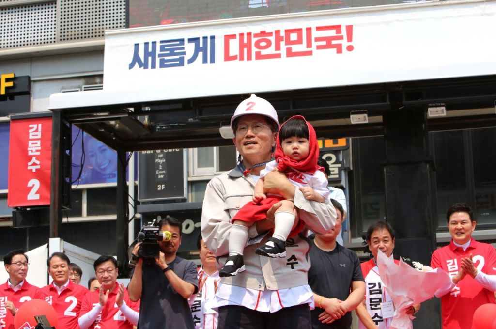김문수 국민의힘 대통령 후보가 경남 창원시 성산구 상남분수광장 집중 유세현장에서 한 지지자의 자녀를 안고 있다. 이세령 기자