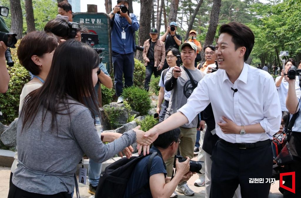 이준석 개혁신당 대선 후보가 28일 서울 여의도공원에서 산책 나온 시민들을 찾아 지지를 호소하고 있다.