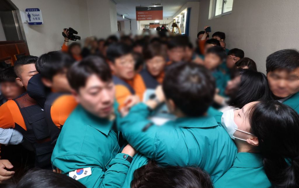 28일 오전 금호타이어 광주공장 노조원들이 광주 광산구청장실 앞에서 공무원들과 몸싸움을 벌이고 있다. 박병규 광산구청장은 전날 대형 화재로 공장을 멈춘 금호타이어 광주공장 이전 문제를 두고 구조조정 등을 언급해 논란을 빚었다. 연합뉴스