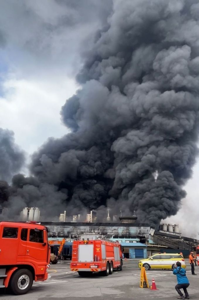 지난 17일 오전 발생한 화재로 금호타이어 광주공장에서 검은 연기가 치솟고 있다. 송보현 기자