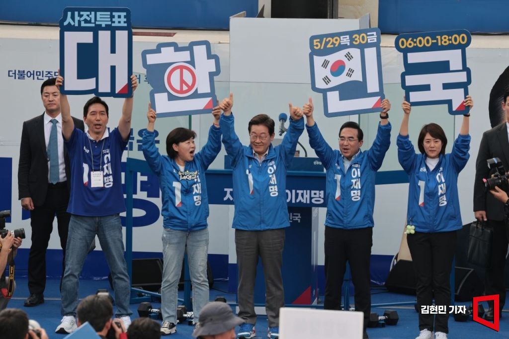 이재명 더불어민주당 대선 후보가 28일 서울 광진구 어린이대공원 정문 앞에서 열린 유세에서 사전투표를 독려하고 있다.
