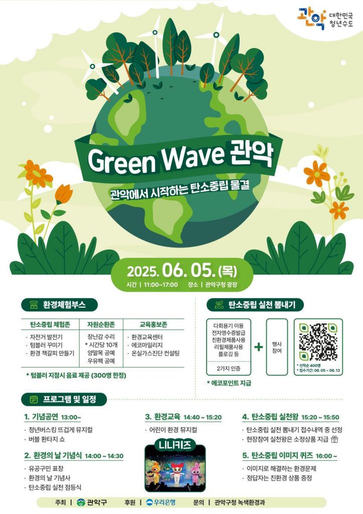 관악구(구청장 박준희)가 올해 제30회 환경의 날을 맞아 오는 6월 5일 탄소중립 실천 문화 확산을 위한 친환경 축제 'Green Wave 관악'을 개최한다.