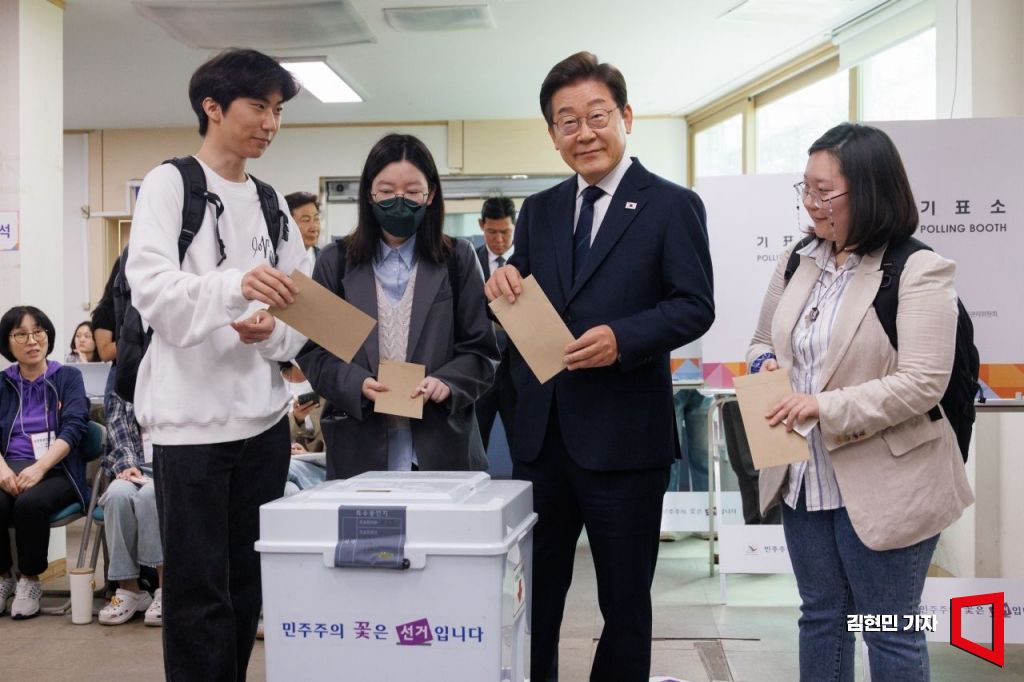 이재명 더불어민주당 대선 후보가 제21대 대통령선거 사전투표 첫날인 29일 서울 서대문구 신촌동 주민센터에서 청년들과 함께 사전투표를 하고 있다. 2025.5.29 김현민 기자