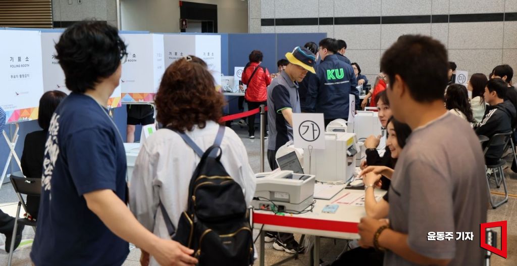 제21대 대통령선거 사전투표 첫날인 29일 서울 중랑구 중랑구청에 마련된 신내2동 사전투표소에서 유권자들이 투표하기 위헤 줄을 서고 있다.