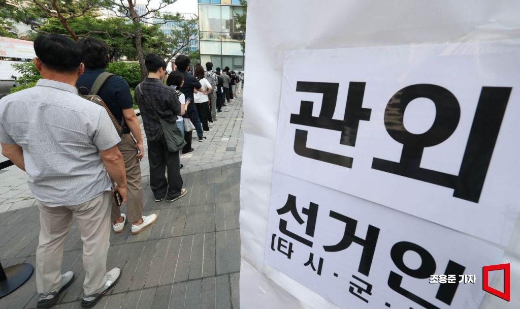 제21대 대통령 선거 사전투표 첫날인 29일 서울 강남구 역삼1동주민센터에 마련된 사전투표소를 찾은 유권자가 투표를 위해 줄을 서고 있다.