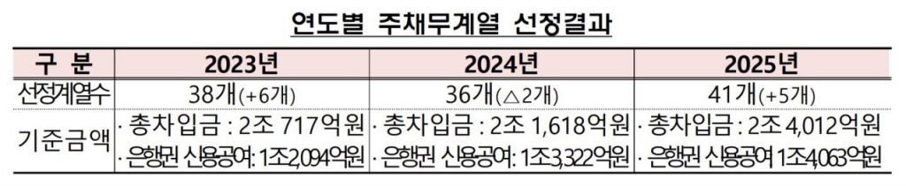 29일 금융감독원은 이 같은 내용의 '2025년 주채무계열 선정 결과'를 발표했다. 금감원은 해마다 금융기관 대출이 많은 기업군을 주채무계열로 선정한다. 주채권은행은 매년 선정된 계열의 재무구조를 평가해 결과가 미흡한 계열에 대해서는 재무구조개선약정 등을 체결하고 자구계획 이행을 점검하는 등 신용위험을 체계적으로 관리해야 한다.