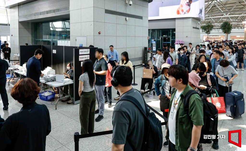 제21대 대통령선거 사전투표가 시작된 29일 인천국제공항 제1여객터미널에 마련된 사전투표소를 찾은 여행객들이 투표를 하기 위해 줄을 서고 있다. 2025.5.29. 강진형 기자