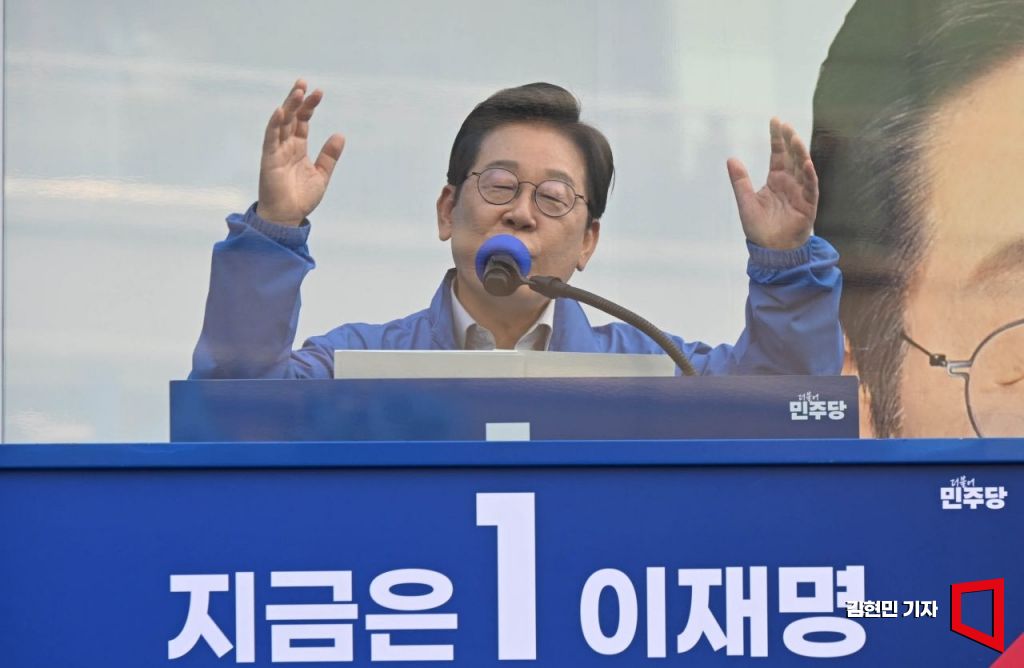 이재명 더불어민주당 대선 후보가 28일 서울 성동구 왕십리역 광장에서 열린 유세에서 연설하고 있다. 2025.5.28 김현민 기자