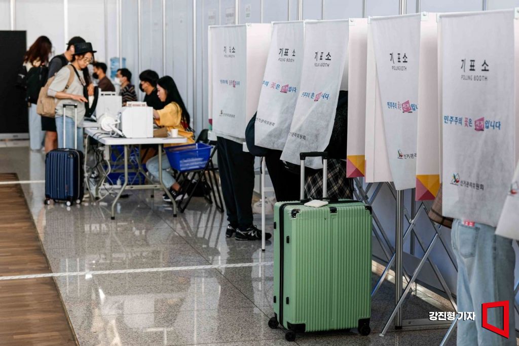 제21대 대통령선거 사전투표가 시작된 29일 인천국제공항 제1여객터미널에 마련된 사전투표소를 찾은 여행객들이 출국에 앞서 투표 하고 있다.