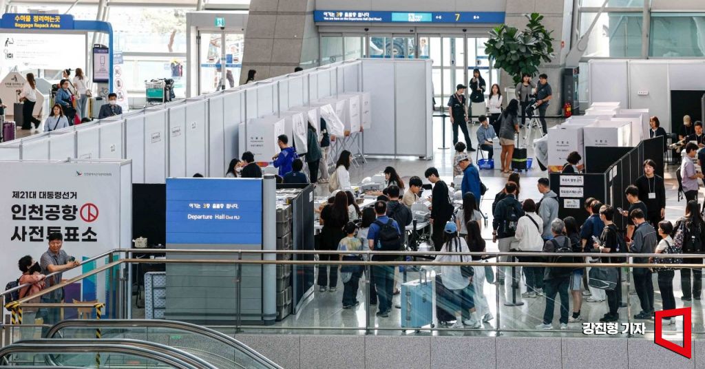 제21대 대통령선거 사전투표가 시작된 29일 인천국제공항 제1여객터미널에 마련된 사전투표소를 찾은 여행객들이 출국에 앞서 투표 하고 있다.