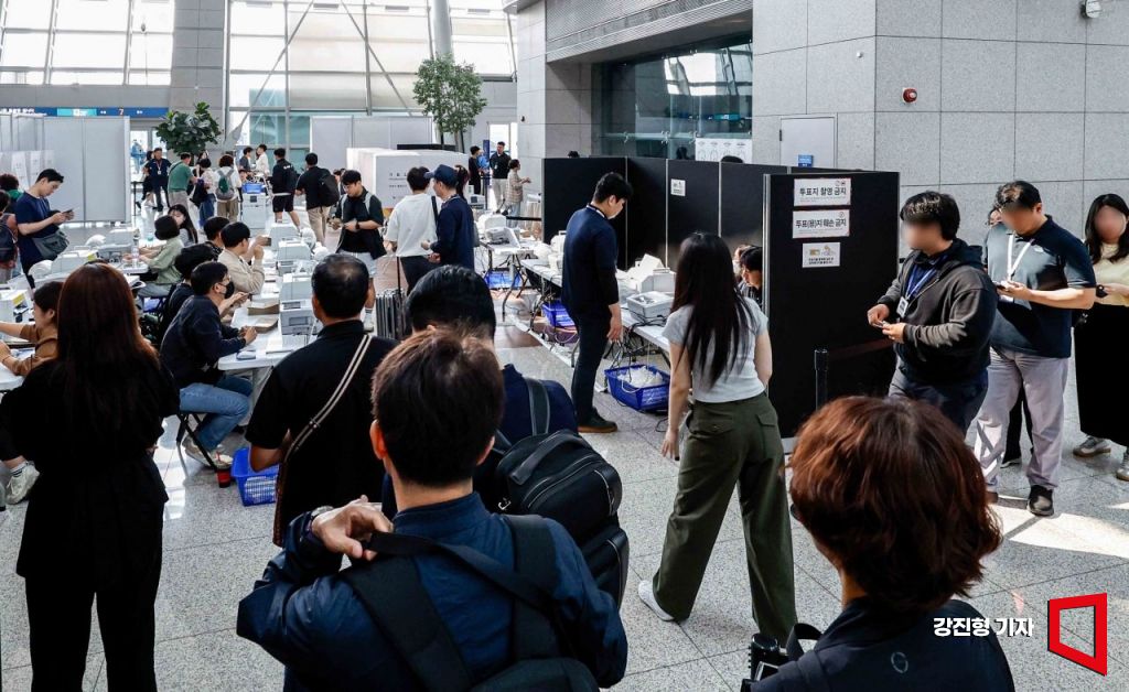 제21대 대통령선거 사전투표가 시작된 29일 인천국제공항 제1여객터미널에 마련된 사전투표소를 찾은 여행객들이 출국에 앞서 투표 하고 있다. 2025.5.29. 강진형 기자
