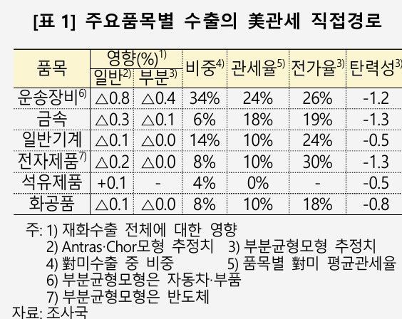 이 같은 분석은 미국 관세율이 현재의 유예된 수준에서 유지될 것이라고 가정된 시나리오다. 중국·캐나다·멕시코 외 모든 국가에 10%의 기본관세가 적용되고 철강·알루미늄, 자동차·부품 품목 관세는 25%로 유지된다고 가정했다. 반도체·의약품 등은 하반기 중 10% 부과 후 변화가 없는 것으로 설정했다.