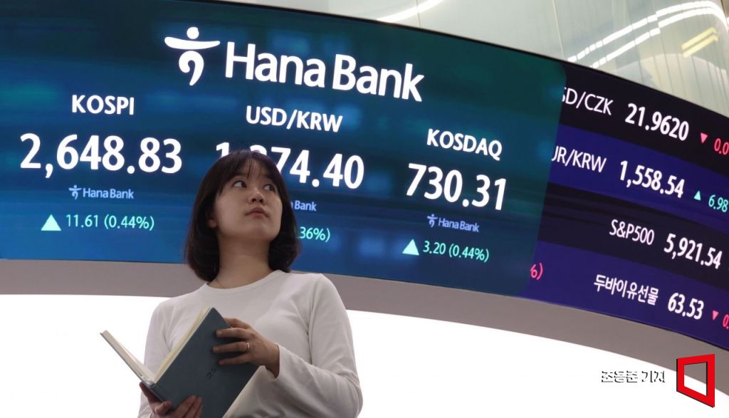 서울 중구 하나은행 본점 딜링룸 현황판에 코스피와 원/달러 환율 등이 표시돼 있다. 조용준 기자