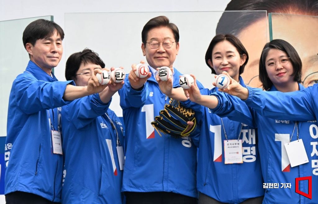 이재명 더불어민주당 대선 후보와 야당 대표들이 29일 서울 송파구 잠실야구장 광장에서 열린 강동구·송파구 집중유세에서 '내란종식'이 쓰여있는 야구공을 들고 포즈를 취하고 있다.