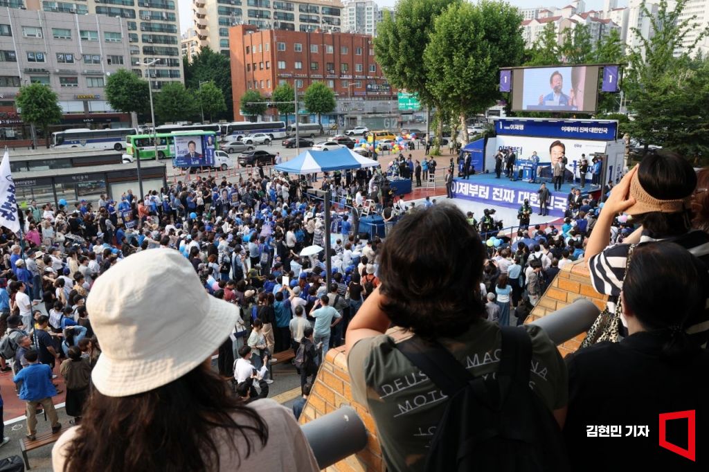 29일 서울 서초구 고속터미널 광장에서 시민들이 이재명 더불어민주당 대선 후보의 유세를 지켜보고 있다.