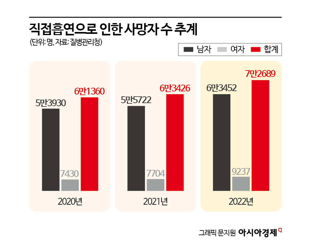 30일 질병관리청에 따르면, 직접흡연으로 인한 국내 사망자 수는 2020년 6만1360명에서 2021년 6만3426명, 2022년 7만2689명으로 점차 증가하고 있는 것으로 나타났다.