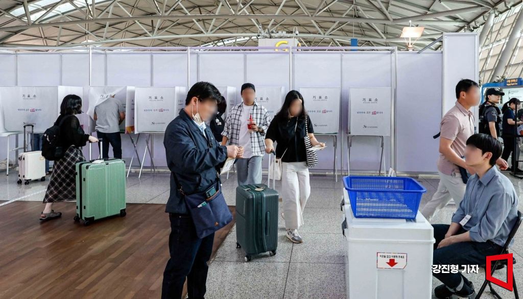 제21대 대통령선거 사전투표가 시작된 29일 인천국제공항 제1여객터미널에 마련된 사전투표소를 찾은 여행객들이 출국에 앞서 투표 하고 있다. 2025.5.29. 강진형 기자