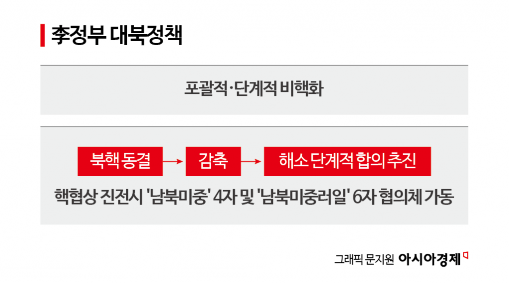 문재인 정부에서는 북·미 정상 간 담판을 통해 '빅 딜'을 기대했던 것과 달리 이재명 정부는 북한의 핵 능력 동결부터 접근해 중장기 단계적 합의를 추구한다. 나아가 핵 협상이 진전될 경우 남·북·미·중 4자 또는 남·북·미·중·러·일 6자 협력 틀을 가동하겠다는 구상이다.