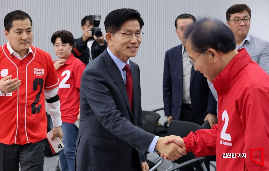 김문수 국민의힘 대선 후보가 30일 서울 여의도 국민의힘 중앙당사에서 대국민 호소문을 발표한 뒤 윤재옥 의원과 인사하고 있다.