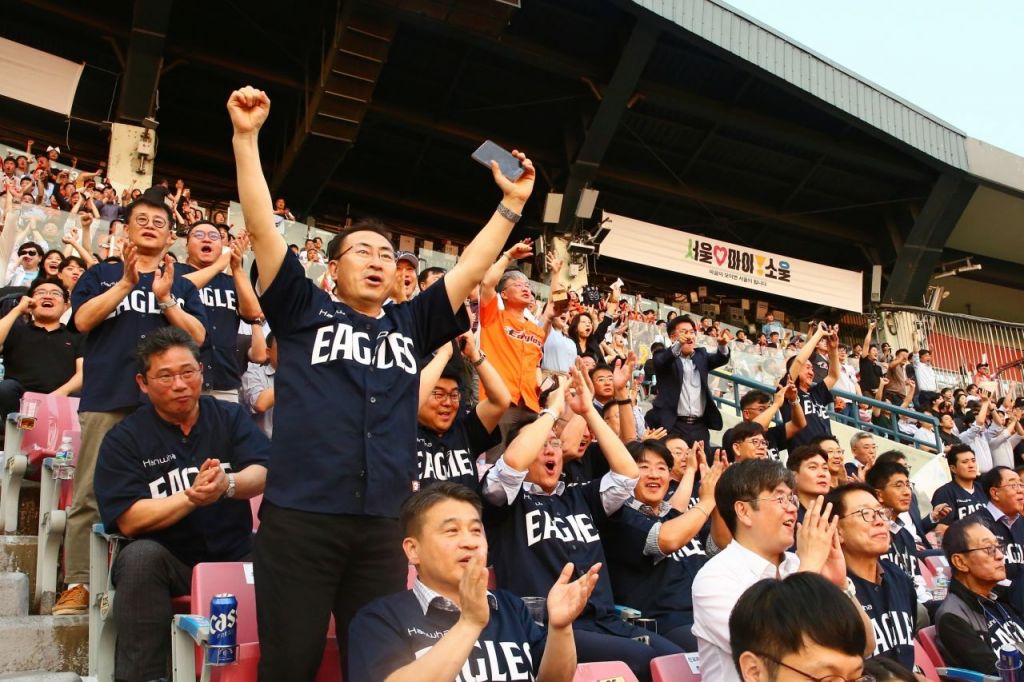 ㈜한화 임직원과 협력사 임직원들이 서울 잠실야구장에서 열린 야구 경기를 관람하며 한화 이글스의 선전을 응원하고 있다. ㈜한화 제공