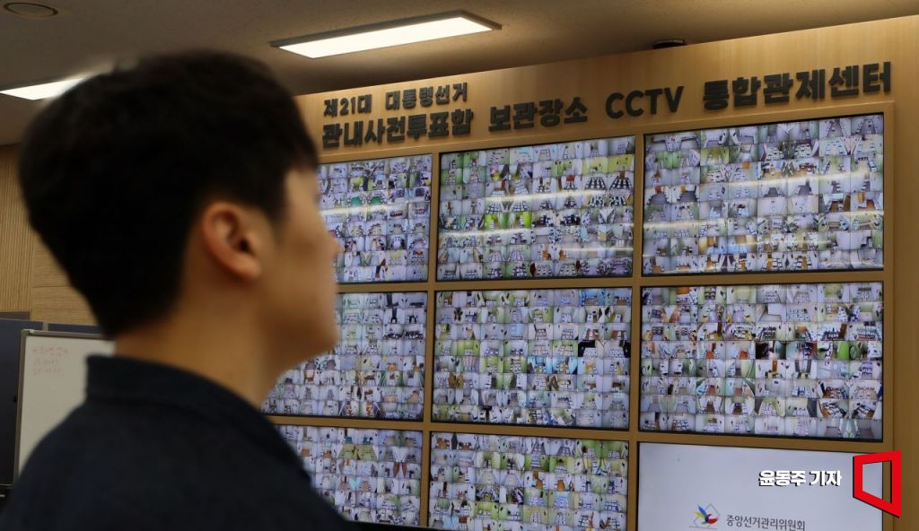 제21대 대통령선거 사전투표 둘째 날인 30일 경기도 과천 중앙선거관리위원회 선거종합상황실에서 한 관계자가 관내사전투표함 보관장소 CCTV를 모니터링하고 있다.