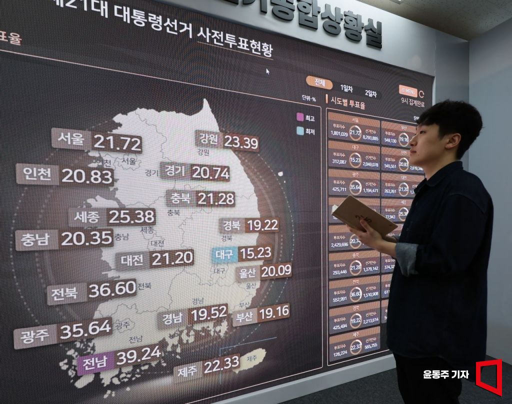 제21대 대통령선거 사전투표 둘째 날인 30일 경기도 과천 중앙선거관리위원회 선거종합상황실에서 한 관계자가 실시간 사전투표 현황을 모니터링하고 있다. 2025.05.30 윤동주 기자