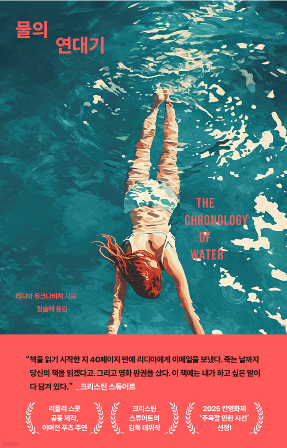 미국 작가 리디아 유크나비치가 2011년에 쓴 회고록 ‘물의 연대기 (원제: The Chronology of Water·숨을 참던 나날들)’가 국내에서 첫 출간됐다. 보통의 자서전이 그러하듯 성공과 회복이라는 익숙한 서사를 기대하고 책장을 펼쳤다면 꽤 당황스러울 것이다. 촉촉한 공기와 하얀 모래사장이 반짝이는 바다의 풍경을 기대했다가 온몸으로 파도를 받아내야 하는 것처럼 이야기는 예상치 못한 방향으로 흘러간다. 그리고 그 안에는 불편하고 어둡고, 때론 숨 막힐 정도로 날것의 감정들이 가득하다.