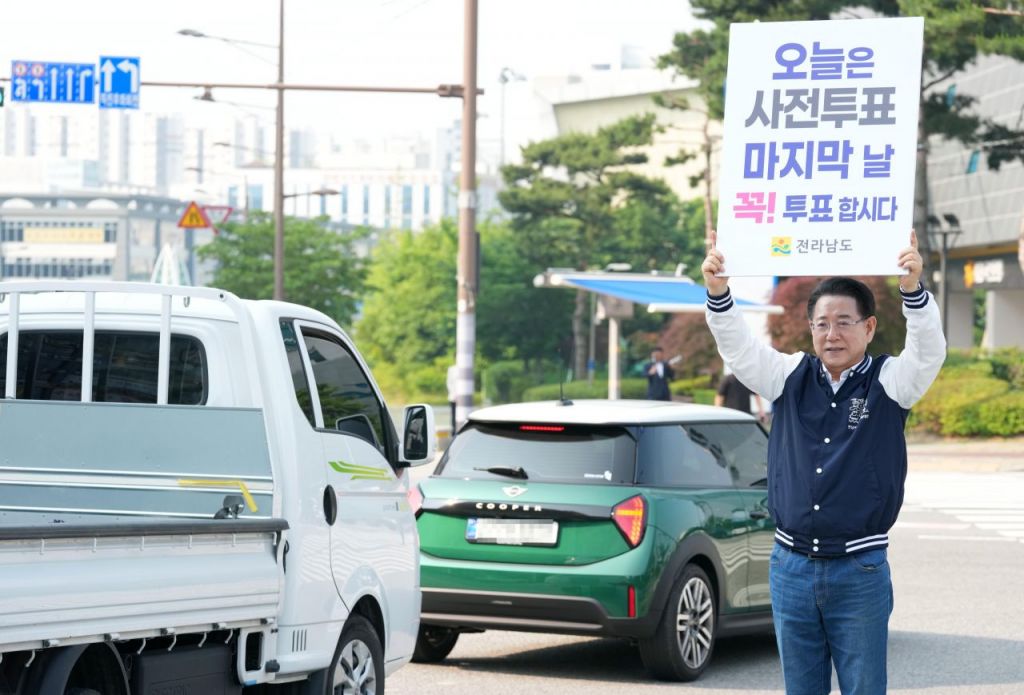 김영록 전라남도지사가 6·3 대통령선거 사전투표 이틀째인 30일 오전 나주 한전 KDN 앞 사거리에서 출근길 도민 및 차량을 향해 투표 참여를 독려하는 1인 캠페인을 전개하고 있다. 전남도 제공