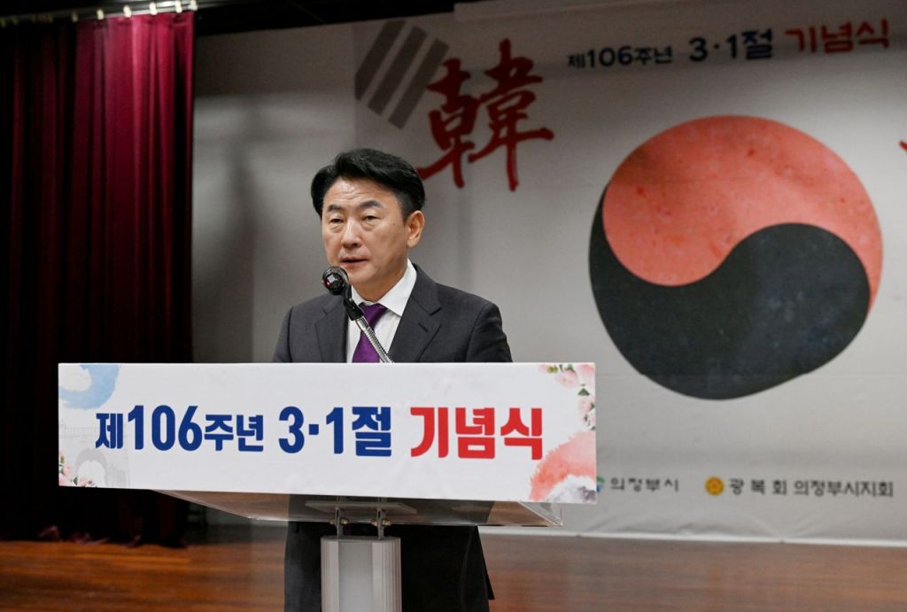 김동근 의정부시장이 제 106회 3·1절 기념식에 참석해 인사말을 하고 있다. 의정부시 제공
