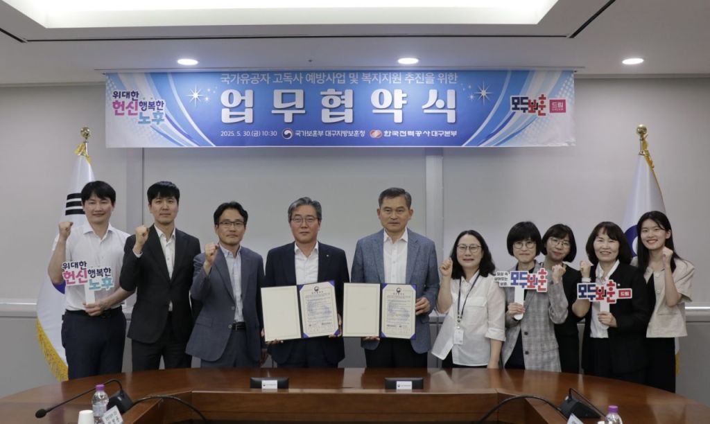 국가보훈부 대구지방보훈청(청장 김종술)은 30일 정부대구지방합동청사에서 한국전력 대구본부(본부장 황상호)와 보훈대상자 고독사 예방과 복지지원 강화를 위한 업무협약을 체결했다.