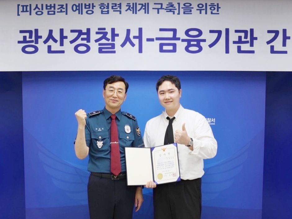 광주은행은 최근 고객의 보이스피싱 피해를 사전에 차단한 공로로 광주 송정지점과 서울 여의도지점 직원이 각각 광주광산경찰서와 서울영등포경찰서로부터 감사장을 수여받았다고 30일 밝혔다.