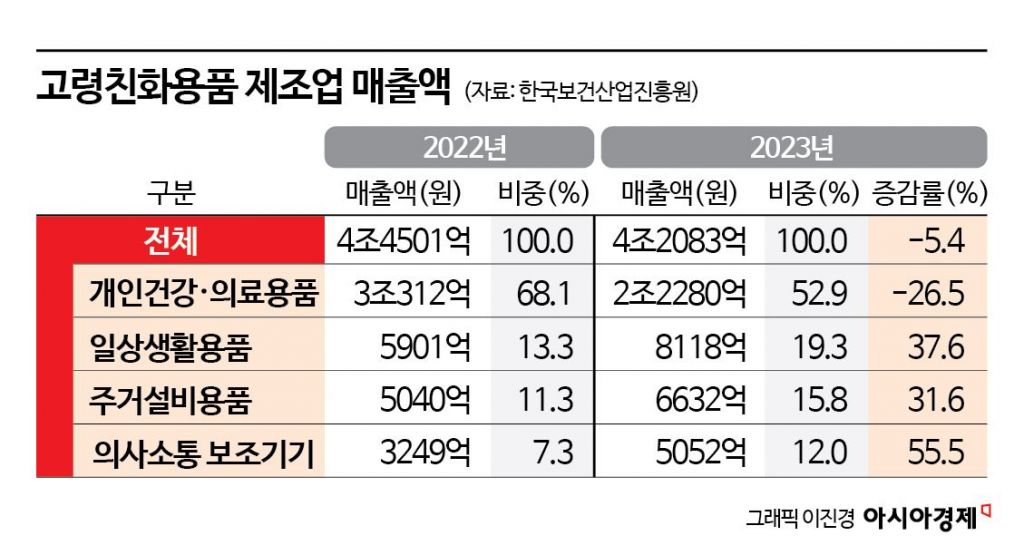 30일 한국보건산업진흥원이 국내 965개 고령친화용품 제조업체를 대상으로 전수 조사한 결과, 이들 기업의 2023년 매출액은 4조2083억원으로 1년 전보다 5.4% 줄었다.