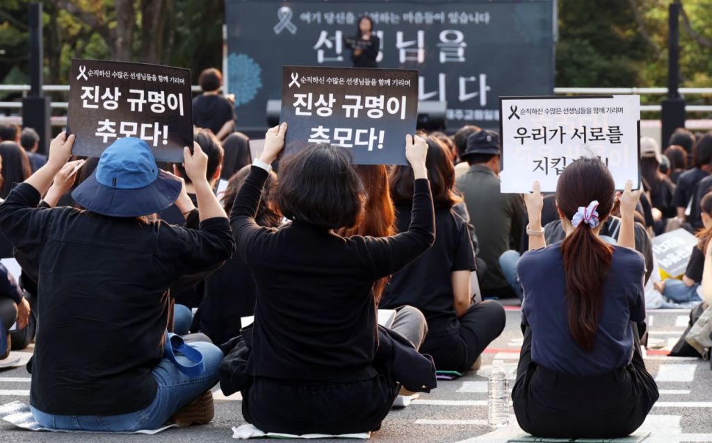 30일 오후 제주도교육청 앞마당에서 열린 제주 모 중학교 교사 추모 문화제에서 참가자들이 '진상규명이 추모다'란 피켓을 들어 올리며 구호를 외치고 있다. 연합뉴스