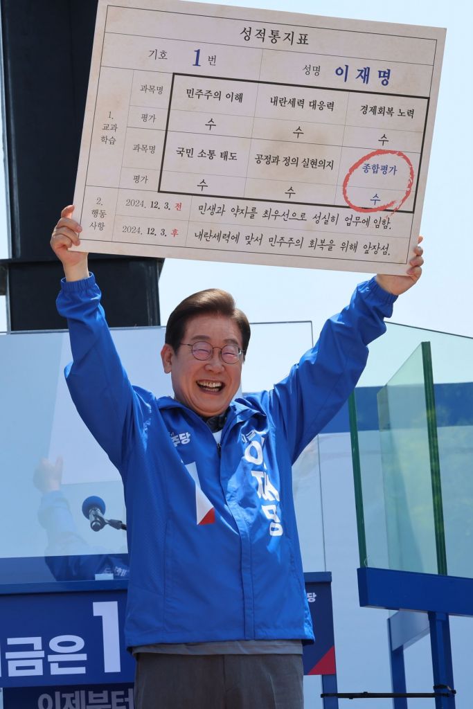 은사님께 받은 '대선 후보 성적표' (안동=연합뉴스) 김주성 기자 = 더불어민주당 이재명 대선 후보가 선거를 이틀 앞두고 '험지 공략'에 나선 1일 고향인 경북 안동시의 웅부공원에서 열린 유세에서 이 후보의 초등학교 은사인 박병기 선생님으로부터 대선 후보 모의 성적 통지표를 받고서 환하게 웃고 있다. 2025.6.1 utzza@yna.co.kr(끝)<저작권자(c) 연합뉴스, 무단 전재-재배포, AI 학습 및 활용 금지>