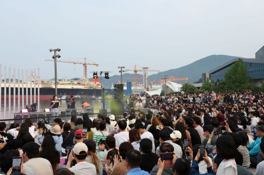 한화오션 거제사업장을 배경으로 실력파 싱어송라이터 나비가 약 1300여명의 시민과 관광객들 앞에서 열창을 하고 있다. 한화오션 제공