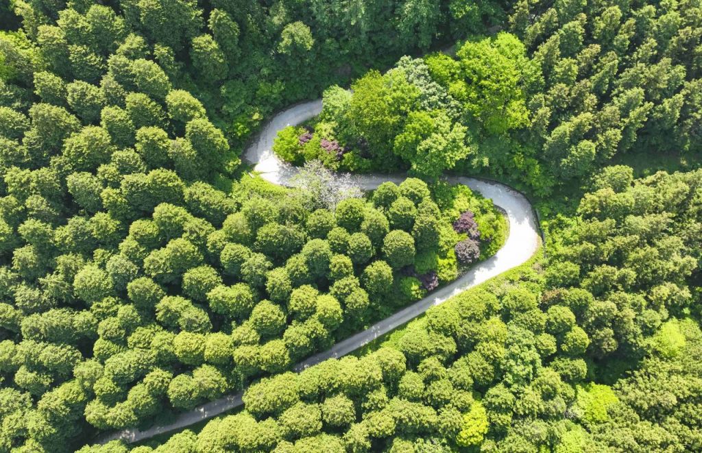 전남 장성 축령산 일대 편백숲을 따라 굽이진 산길이 이어지고 있다. 장성군 제공