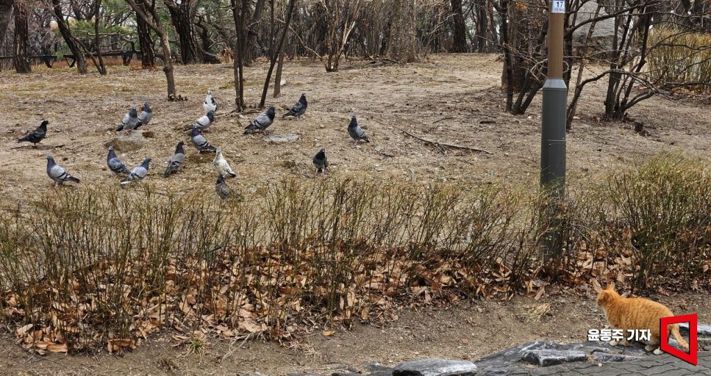 길고양이가 건너편에 있는 비둘기를 하염없이 처다보며 사냥하는 상상의 나래를 펄친다. 윤동주 기자