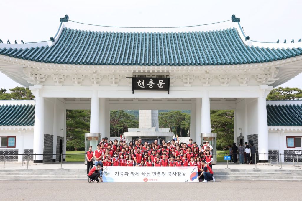 롯데건설 '샤롯데 봉사단'이 지난달 31일 서울 동작구 국립서울현충원에서 봉사활동 후 현충문 앞에서 기념촬영을 하고 있다. 롯데건설 제공