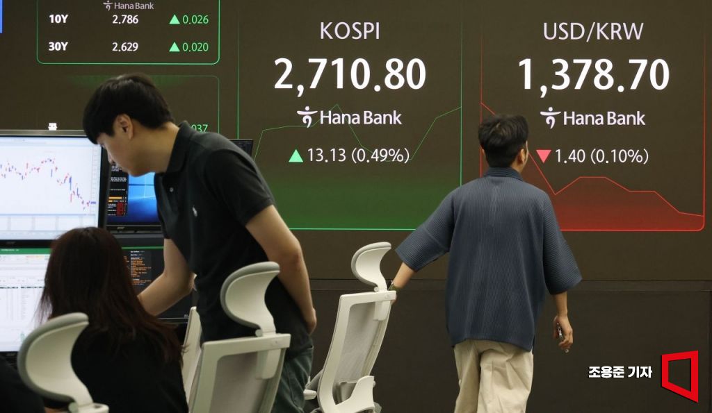 2일 서울 중구 하나은행 딜링룸 현황판에 코스피와 원/달러 환율, 코스닥이 표시되고 있다. 이날 코스피는 9시25분 현재 전장보다 18.28포인트 (0.66%) 오른 2,716.23을 보이며 2700선에 재안착 했고 코스닥은 4.25포인트(0.61%) 오른 738.80을 보이고 있다.