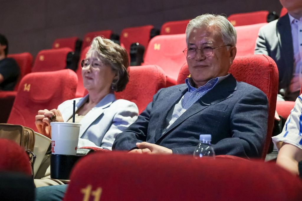 문재인 전 대통령 부부가 지난달 31일 부산에서 열린 영화 '바다호랑이' 상영회에 참석해 관람하고 있다. 영화로운형제