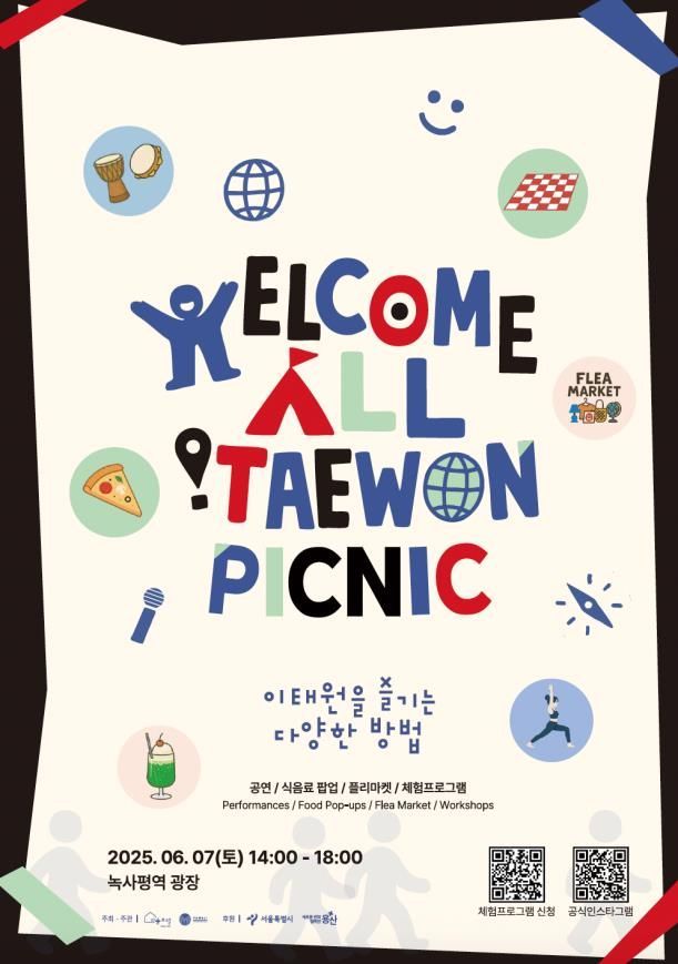 서울 용산구가 오는 7일 오후 2시부터 6시까지 녹사평광장 일대에서 야외 문화행사 ‘웰컴 올 이태원 피크닉(Welcome All ITW Picnic)’을 개최한다. 이번 행사는 이태원 로컬브랜드 상권 강화사업의 일환으로 ‘누구나 환영받는 도시의 쉼표’를 주제로 마련됐다.
