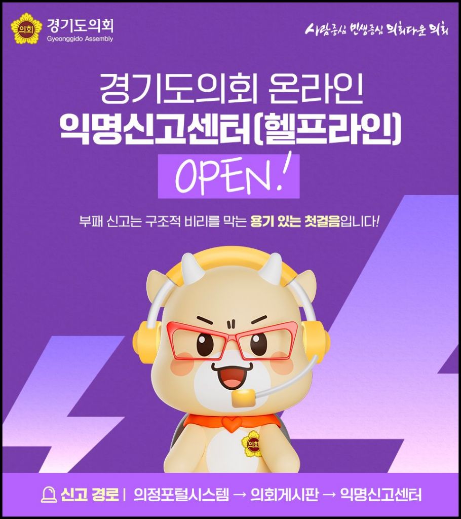 경기도의회가 '온라인 익명신고센터(헬프라인)'를 운영한다.