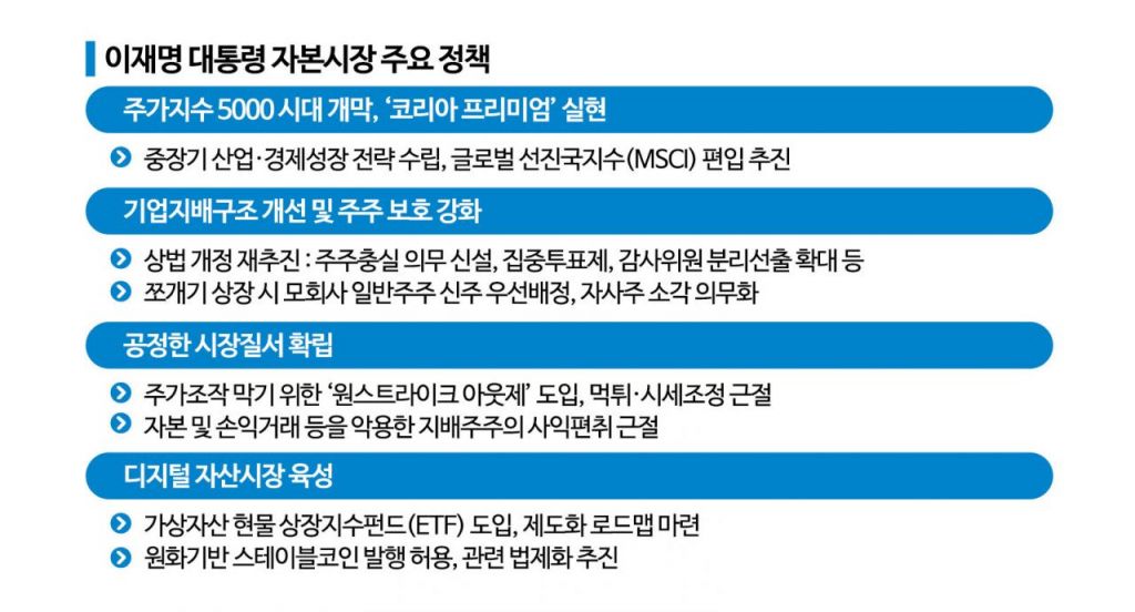 이재명 정부의 자본시장정책은 기업 거버넌스 개혁을 통한 '코스피 5000 달성'으로 요약된다. 구체적으로는 상법 개정, 자사주 소각 의무화, 주가조작 원스트라이크 아웃제 등 소액주주 보호를 위한 정책에 방점이 찍혀 있다. 가상자산 현물 상장지수펀드(ETF) 도입 등 디지털 자산 육성도 급물살을 탈 전망이다.