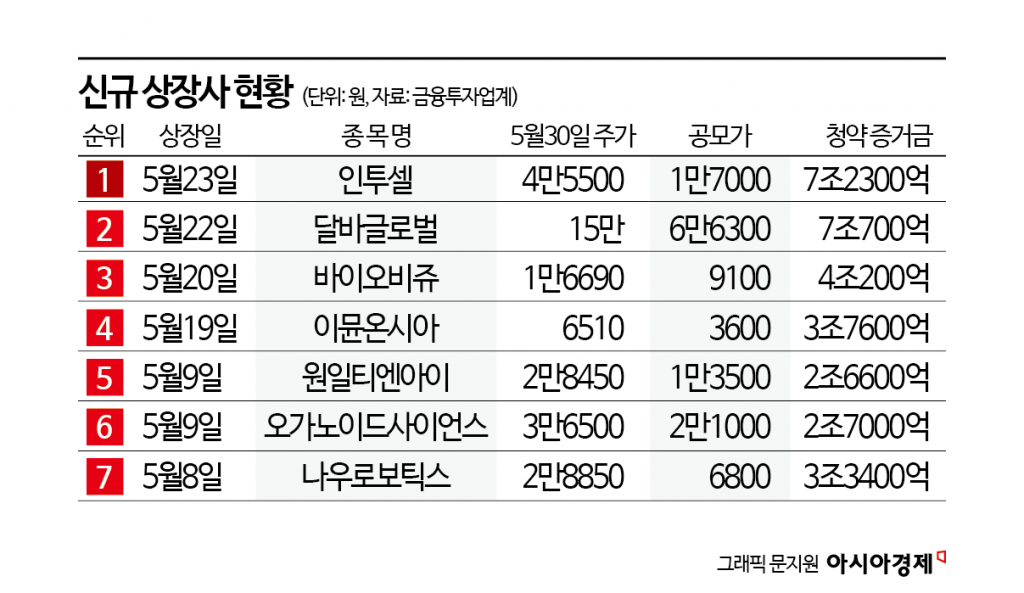 지난달 주식시장에 진입한 신규 상장사 대다수가 공모가 대비 높은 수익률을 기록했다. 지난달 상장한 9개사 가운데 스팩을 제외한 8개사의 공모가 대비 시초가 평균 수익률은 87.9%에 달했다. 상장 당일 공모가 대비 종가 평균 수익률은 93.8%를 기록했다. 지난달에 달바글로벌과 인투셀, 바비오비쥬, 이뮨온시아, 로킷헬스케어, 원일이엔아이, 오가노이드사이언스, 나우로보틱스 등이 상장했다.