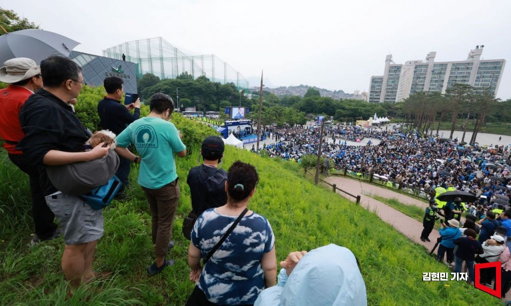 제21대 대통령 선거를 하루 앞둔 2일 서울 강북구 북서울꿈의숲 서문광장에서 열린 이재명 더불어민주당 대선 후보의 유세를 많은 시민들이 지켜보고 있다.