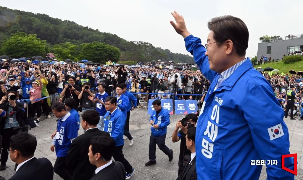 이재명 더불어민주당 대선후보가 2일 오전 서울 강북구 월계로 북서울 꿈의숲 서문광장에서 열린 유세에서 연단에 올라 손을 들어 보이고 있다.